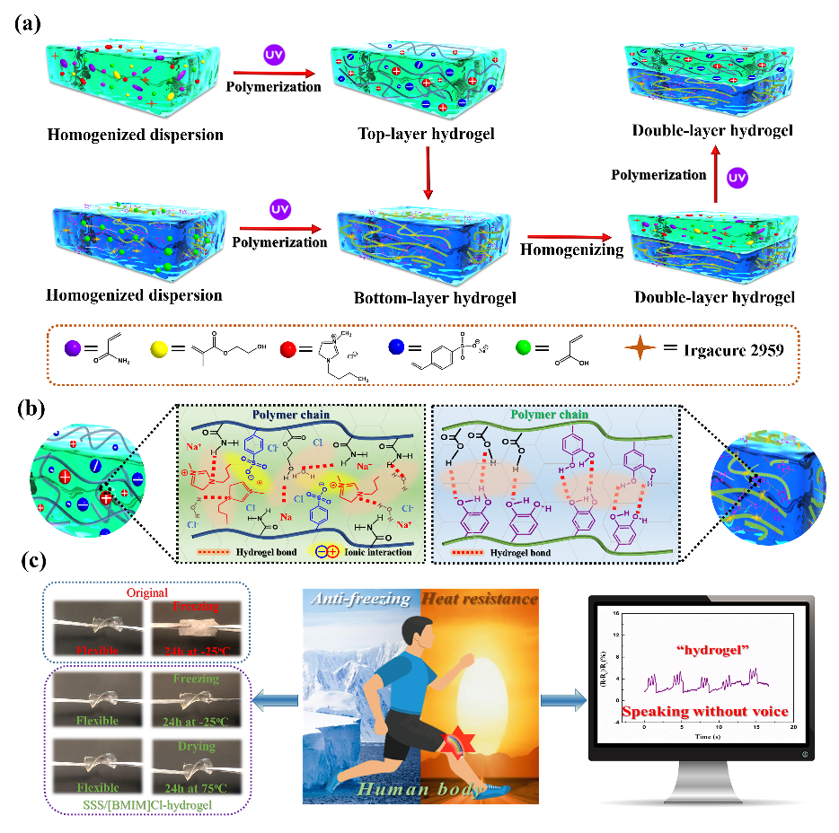 该研究针对传统水凝胶在冷冻和脱水环境下的界面失效导致传感功能降低的问题,开发了一种多功能双层水凝胶传感器,此传感器由贻贝启发的粘合剂层和对苯乙烯磺酸钠(SSS)与[BMIM]Cl离子液体组成的功能离子层组成。其中粘合剂层可以使传感器牢固地粘附在皮肤表面,SSS-[BMIM]Cl离子元素的引入不仅为双层水凝胶提供了宽温度范围内的传感适应性,还赋予其良好的弹性、可拉伸性、自愈合和导电等特性。所制传感器能够在人体运动监测(包括:伸展、脉动、皱眉和说话)方面表现出良好的灵敏度和可重复使用性。因此,该工作提出的多功能双层水凝胶的新概念,为设计构建高性能宽温度范围应用的传感器提供了新的可能性。