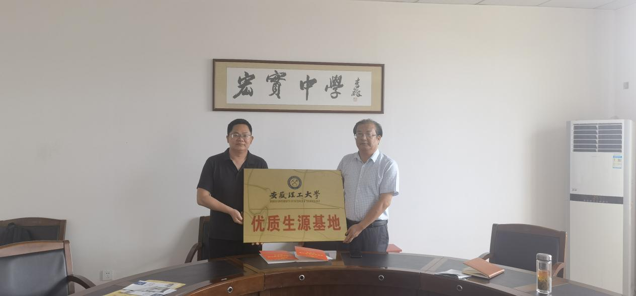 在宏实中学,李争介绍了安徽理工大学和外国语学院的办学历史、人才培养、创新创业、招生就业等方面的基本情况,他希望以我校与宏实中学共建优质生源基地为契机,主动沟通联系,积极加强合作,建立长效机制,为选拔、输送和培养优秀学生搭建更好的平台。宏实中学副校长鲍时仁介绍了中学的基本概况。他希望双方建立沟通协作机制,加强信息交流,加大宣传力度,积极引导宏实中学优秀学生报考安徽理工大学。最后,双方共同签署了《安徽理工大学优质生源基地共建协议书》并举行了优质生源基地授牌仪式。