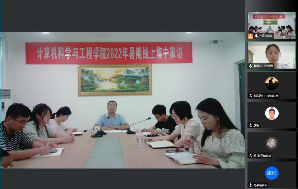 为进一步加强和改进大学生思想政治教育工作,推深做实学校“三全育人”综合改革,进一步提高精准资助工作水平,密切学校、学院与学生家庭的联系,更好发挥家庭育人功能,7月1日上午,计算机科学与工程学院开展了2022年暑期线上集中家访活动。学院党委副书记刘中廷、全体辅导员、学生资助宣传大使以及部分学生家长参加了会议。