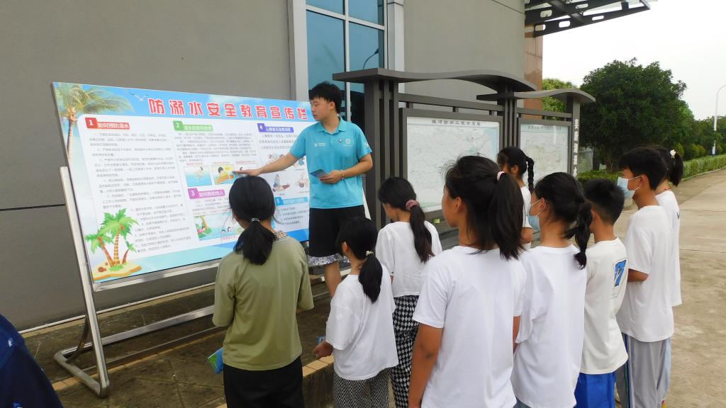 7月5日上午,实践团的志愿者走访入户发放宣传单,宣传防溺水、防电诈安全知识,主动构筑起家庭及留守儿童的生命安全坚实防线;并联合赛涧回族乡中心学校前往姜唐湖退水闸管理处开展现场防溺水宣传教育。为增强宣传效果,现场还布置了宣传展板和宣传条幅,并为大家发放了宣传袋、宣传手册。