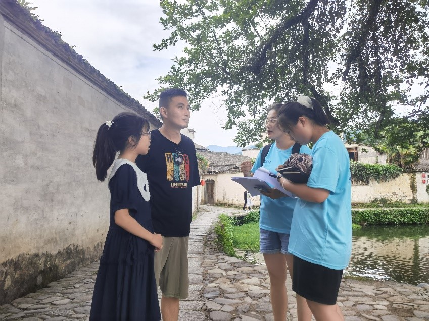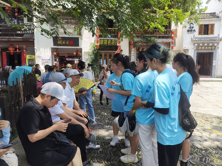 6月25日至26日,两支实践团队成员分别前往黟县、歙县两地实地探寻徽州地区发展的流量密码,助力乡村振兴。通过查阅文献资料、访谈当地住户、村干部等渠道,队员们欣喜地得知黄山市推行“旅游+”“生态+”等模式,深度盘活传统村落资源,推进农业、林业与旅游、教育、文化、康养等产业深度融合,大力发展休闲度假、旅游观光、养生养老、农耕体验、农业创意、乡村手工艺等产业,打造一批繁荣农村、富裕农民的新业态,赋能美丽乡村建设,同时也深切地察觉到徽文化的知名度和影响力有待提升,民众对其尚未形成清晰认知,徽文化仍需在信息化时代中保持其独特性,并积极融合移动媒体来发扬传播。