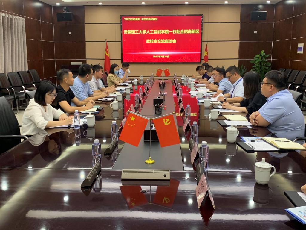 在中国声谷,学院与合肥高新区人事劳动局、人力资源开发管理中心以及安徽青松食品集团、科大国创软件股份有限公司、安徽宝信信息科技有限公司、安徽方正北斗电子科技有限公司、安徽陆零壹信息科技有限公司、合肥大智慧财汇数据科技有限公司、合肥善达信息科技有限公司等8家企业进行座谈交流,就毕业生岗位需要、人才培养需求、校企合作等事宜进行了座谈。座谈会上,播放了安徽理工大学的宣传片。张旸简要介绍了学校和学院近年来的发展情况、学院2023届毕业生情况,对中国声谷在人才需求、科技合作等方面对学院的支持表示感谢,他强调,中国声谷是合肥人工智能高新产业聚集地,也是安徽科技创新的策源地,希望学院和企业双方能够通过全方位的交流实现优势互补,在资源共享的基础上深度合作,共同助力安徽地方经济发展、推动就业保民生,为建设美好安徽贡献更多力量。合肥市高新区人事劳动局副局长姚迪热情接待张旸一行。他从园区历史、区情概况、人才资源等方面介绍了高新区发展成果,希望借此次机会与学校和学院达成深入合作,吸引更多优秀学子来高新区就业创业。各企业代表分别介绍了公司主营业务和人才招聘等情况。