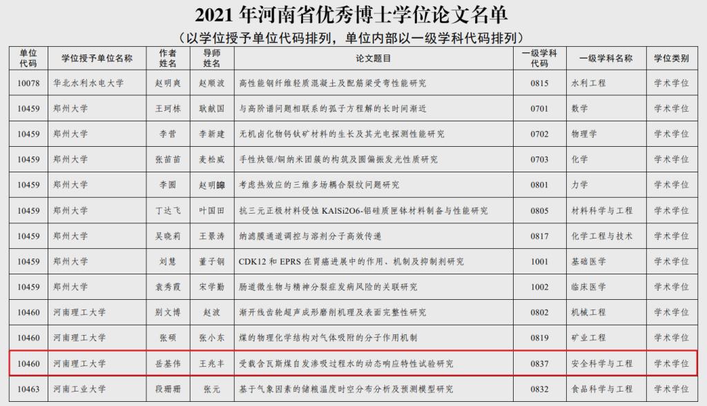 8月17日,河南省2021年度优秀博士学位论文评选揭晓。安全学院2021年8月引进的河南理工大学博士岳基伟的论文《受载含瓦斯煤自发渗吸过程水的动态响应特性试验研究》榜上有名。