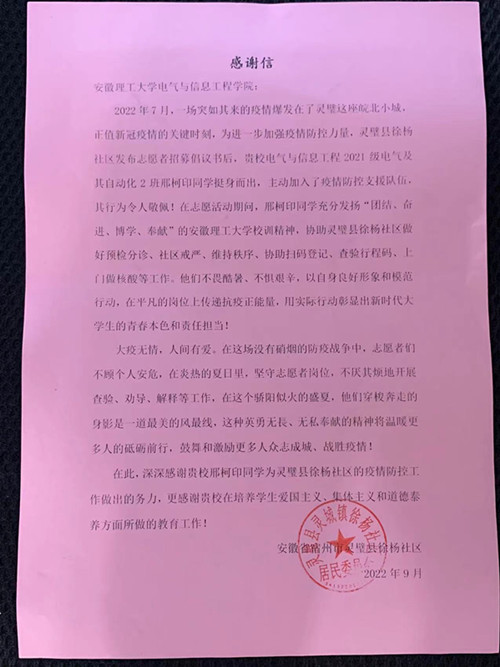 近日,安徽理工大学电气与信息工程学院收到了安徽省宿州市灵璧县灵城镇徐杨社区为学院电气工程及其自动化21-2班邢柯印同学寄来的感谢信,对于邢柯印踏实肯干,积极投身于防疫一线志愿服务给予感谢和表扬。