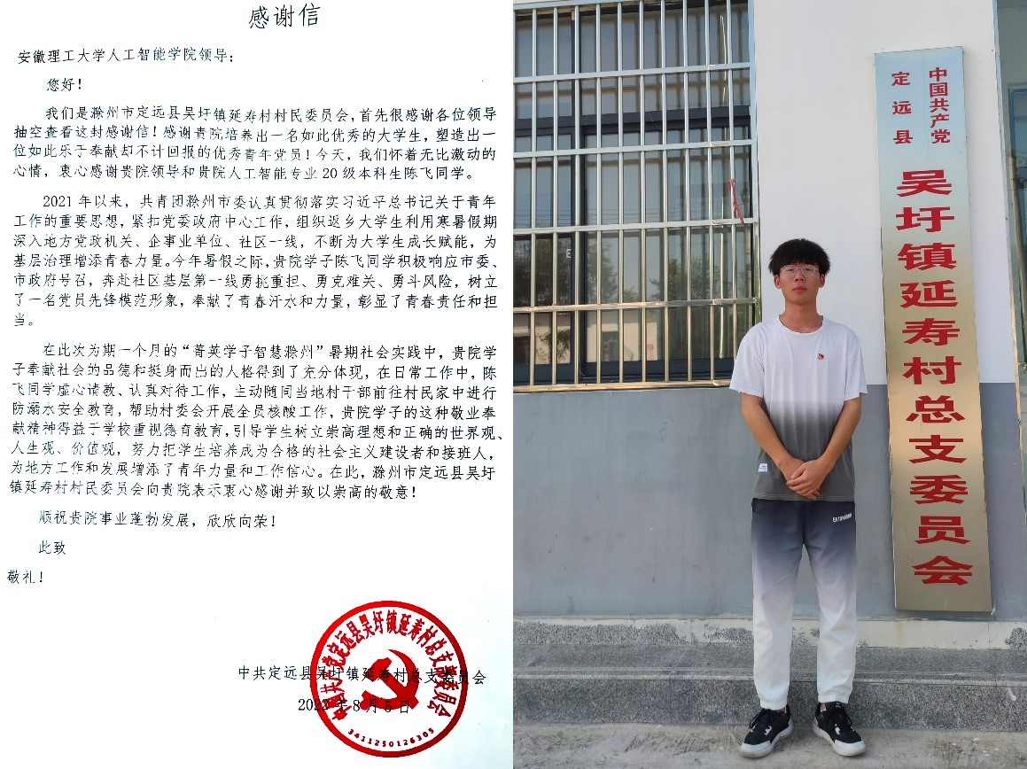 为了积极响应团中央、团省委和校团委的号召,提高社会实践能力,“安徽省优秀共青团员”获得者、2020级人工智能专业陈飞同学在吴圩镇延寿村村委会进行了为期一个月的暑期社会实践活动。在村委会的办公室,陈飞同学协助工作人员做会议记录,收集整理相关材料;参与组织延寿村的党员活动,前往村民家中普及防溺水安全知识、开展安徽省自建房房屋普查等多项活动。