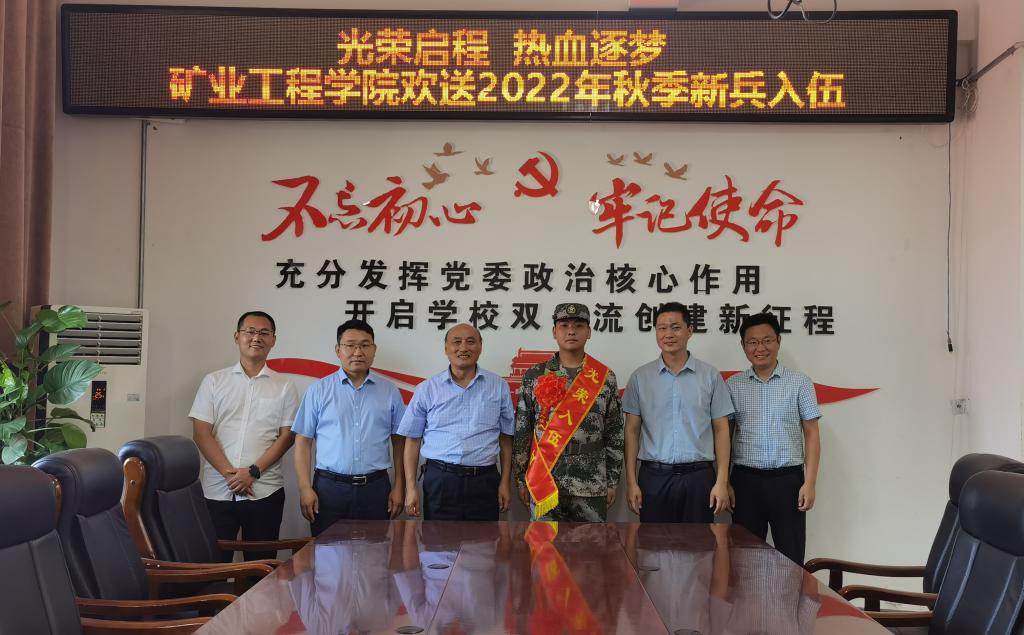 9月8日下午,矿业工程学院在宁远楼A406举办2022年秋季新兵入伍欢送仪式暨征兵动员会。学院党委书记盛鹏飞出席线下座谈会,2019级毕业班全体同学线上参会。会议由院党委副书记田秋实主持。
