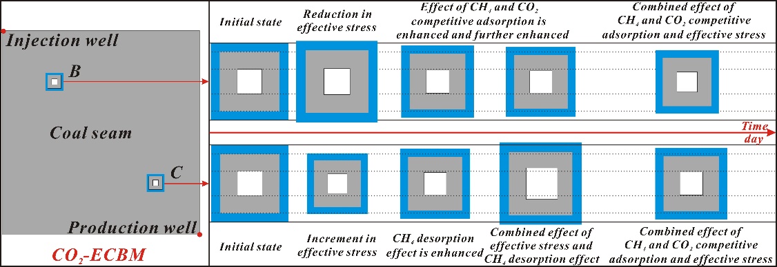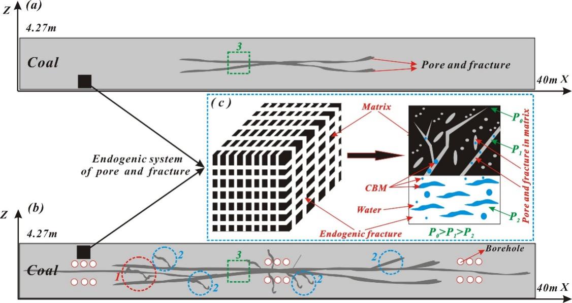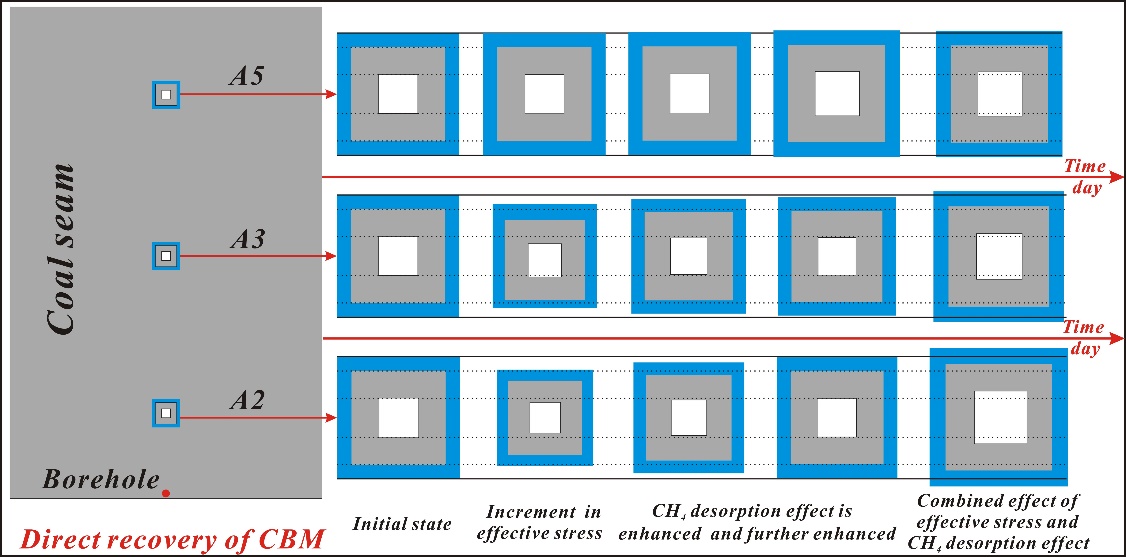 该研究综合考虑了温度效应、基质收缩效应、有效应力效应对煤储层流体运移及其渗透率等储层物性参数的影响,建立了煤层气开采过程中的流体场-温度场-应力场等多物理场全耦合数学模型,并进行了有限元法的多物理场耦合求解;示意了煤层气开采过程中渗透率的降低、回弹、恢复及增强规律现象,并详细分析了初始地质因素及后期工程实践等参数对其演化规律的影响;探讨了CBM与CO2-ECBM过程的渗透率演化机制,并剖析了渗透率变化对CO2地质封存的指示内涵。