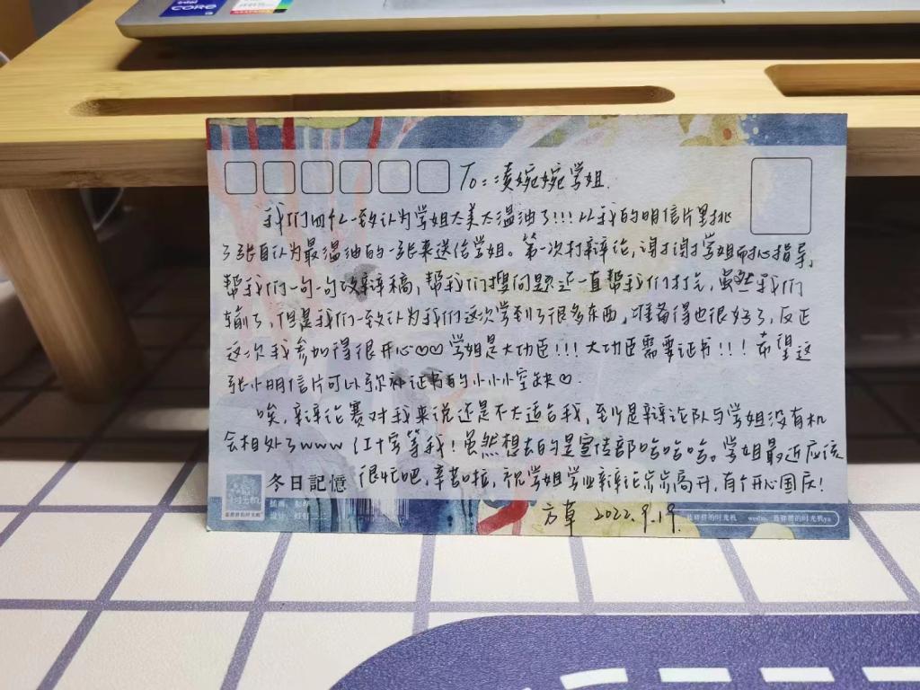 9月19日晚,21级学生凌婉婉作为朋辈导师的一员收到了四名新生的明信片,“温油”的明信片里表达了四位学妹对学姐的喜爱和感谢,她们以朋友的方式相互吸引、共同进步、一起激励成长。