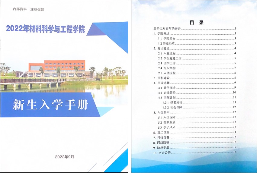 为帮助新生快速适应新环境,结合学院特点,精心设计编撰并发放材料学院新生入学手册。在新生入学手册中,为2022级新生详细列出了学院概况、党团建设、学科建设、毕业就业政策、科技竞赛等多方面的服务信息。同时,新生辅导员详细为新生一一介绍手册内容,帮助新生尽快完成角色转化,尽早规划大学生活,尽情燃放青春。