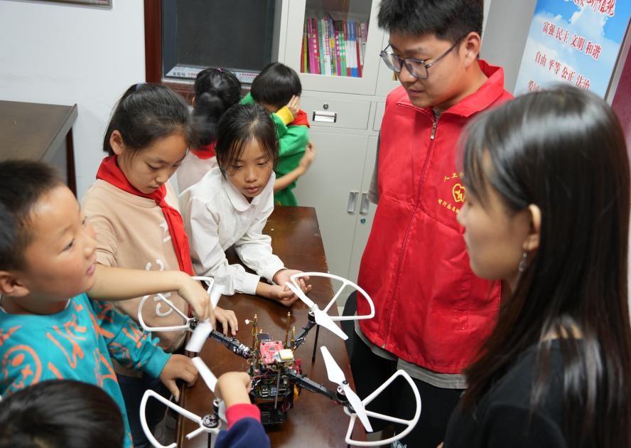 2020级人工智能专业的王子龙向孩子们介绍他在第十七届大学生智能汽车竞赛摄像头四轮组中获得安徽省第二名的作品智能小车。智能小车作为现代的新发明,它可以按照预先设定的模式在一个环境里自动运作,不需要人为管理,可应用于科学勘探等方向。随后,他又讲解了通过使用无线电遥控设备和自备的程序控制装置操纵或者由车载计算机完全地或间歇地操作的“无人机”,并在室外进行飞行展演。在他的一系列讲解与演示下,社区的孩子们感受到了科技领域的广阔、深邃与神奇。