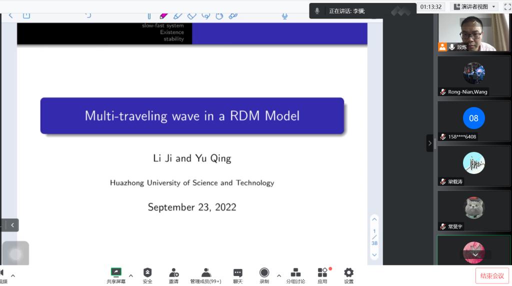 在报告中,王荣年教授介绍了所研究模型的研究背景和最新进展,详细分析了分数次幂和时间外力项对超耗散Navier-Stokes方程弱解长时间动力学行为的影响;李骥教授首先介绍了用以模拟心肌细胞的反应扩散力学系统,在几何奇异扰动理论框架下,分析了所研究模型行波脉冲的稳定性,并进一步证明了多脉冲波的存在性。