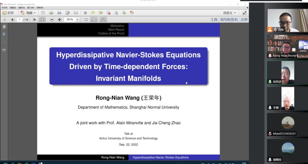 9月23日上午,应科研部和数大学院的邀请,上海师范大学王荣年和华中科技大学李骥两位教授通过腾讯会议分别作了“Hyperdissipative Navier-Stokes Equations Driven by Time-dependent Forces: Invariant Manifolds(依赖时间外力项驱动的超耗散Navier-Stokes方程:不变流形)”和“一类心肌细胞模型的复杂行波”的学术报告。数大学院院长赵前进教授主持报告会,学院微分方程与动力系统团队青年老师和研究生认真聆听了学术报告。