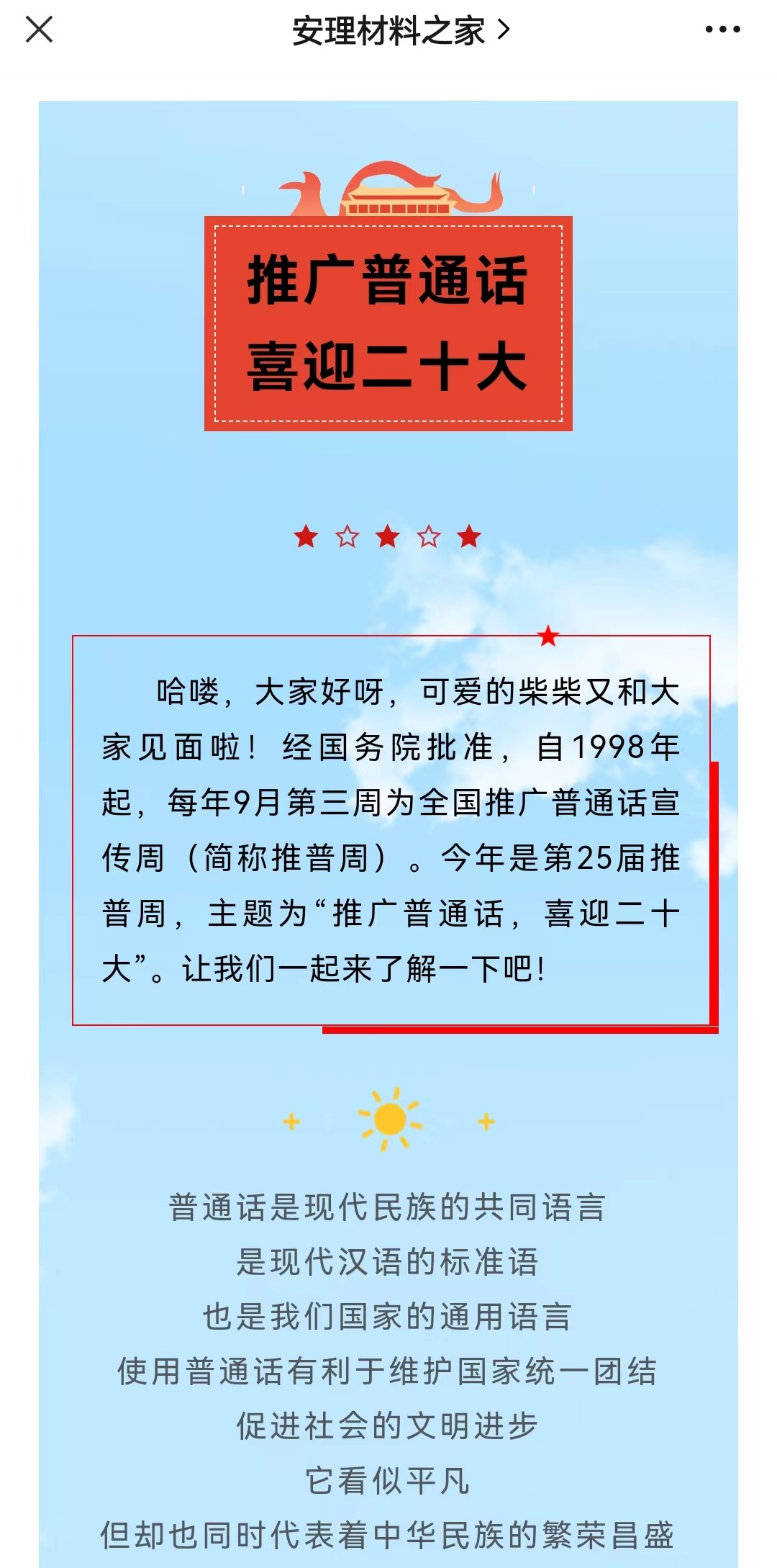 学院利用“安理材料之家”微信公众号,宣传介绍普通话的发展史,为什么要推广普通话以及如何推广普通话。全院师生可以运用便捷的方式获得普通话的基本知识,并且积极成为普通话宣传者、推广者。