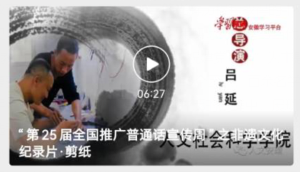 学院利用“人文安理”微信公众号,开展“第25届全国推广普通话宣传周”之非遗文化纪录片系列活动。在各大媒体上展播的短视频既推广了国家通用语言文字,歌颂了工匠们用心守护和创新传统技艺的匠人精神,又传承和弘扬了地方非遗文化。