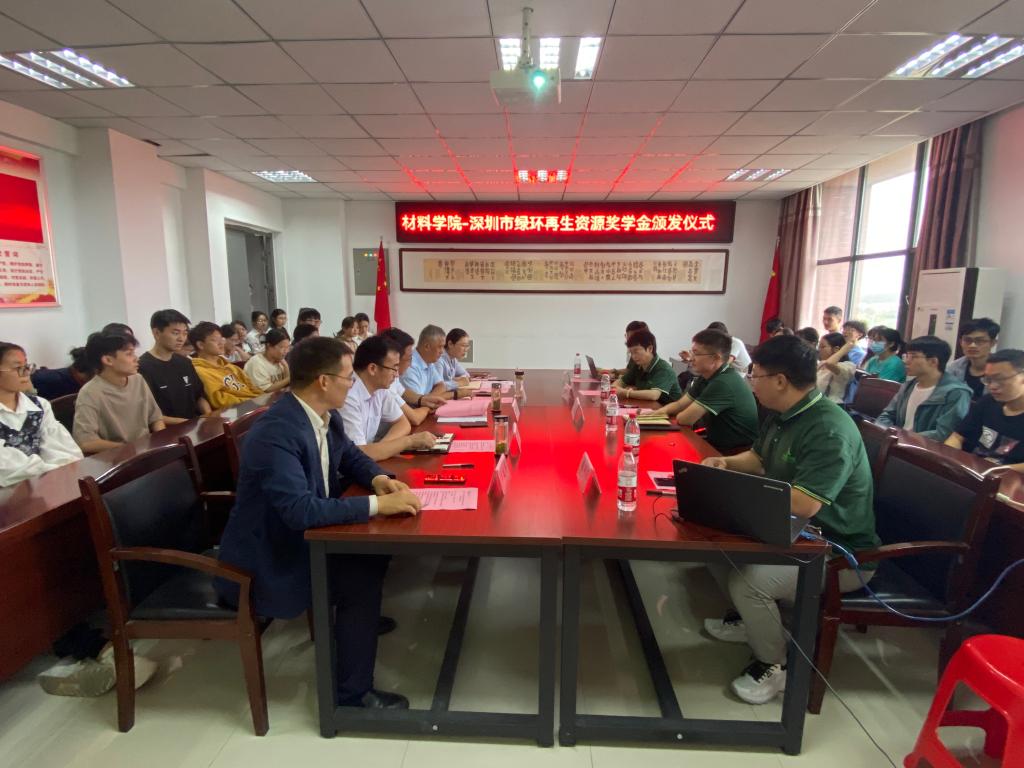 9月27日下午,深圳市绿环再生资源开发有限公司总经理包冬冬、副总经理杨映清一行来校颁发“绿环再生资源”奖学金。材料科学与工程学院领导班子成员、无机材料与资源循环系主任、各专业学生代表参加会议。会议由学院党委副书记陈向君主持。