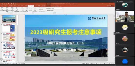为了让考研同学了解当前考研形势与政策,提高学生考研成功率和升学率,在考研报名前夕,机械工程学院于10月4日下午,以腾讯会议的形式召开了2023届毕业生考研形势宣讲会。会议由执行院长王开松宣讲,毕业班辅导员及考研学生200多人参加了宣讲会。