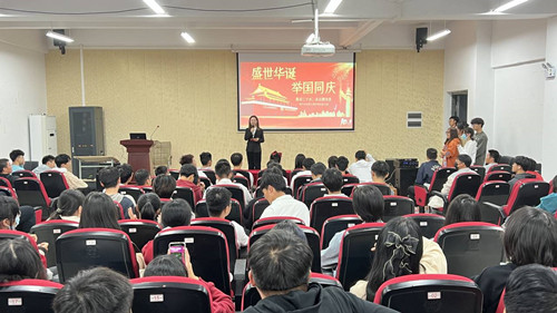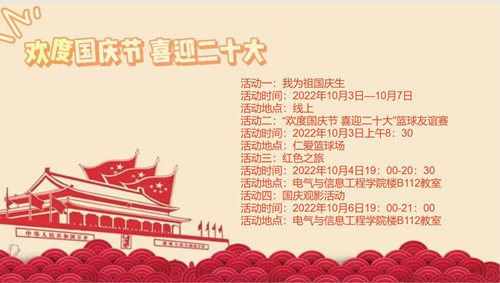 为庆祝中华人民共和国73载华诞,喜迎二十大召开,大力弘扬以爱国主义为核心的伟大民族精神,电气与信息工程学院精心筹划、组织开展了“欢度国庆节,喜迎二十大”主题活动,全院学生共同庆祝中华人民共和国成立73周年,为伟大祖国送上生日祝福。