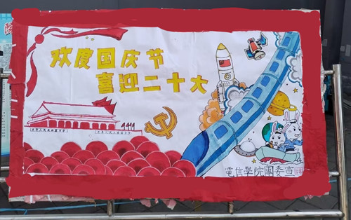 线上线下同步宣传,营造国庆浓厚氛围。在新中国成立73周年伟大时刻到来之际,电信学院团委绘制好国庆节展板放置在学院楼门口进行宣传;精心准备了活动电子宣传海报,由各年级辅导员在学生群里进行广泛宣传,为国庆系列活动提前预热,营造热烈氛围。