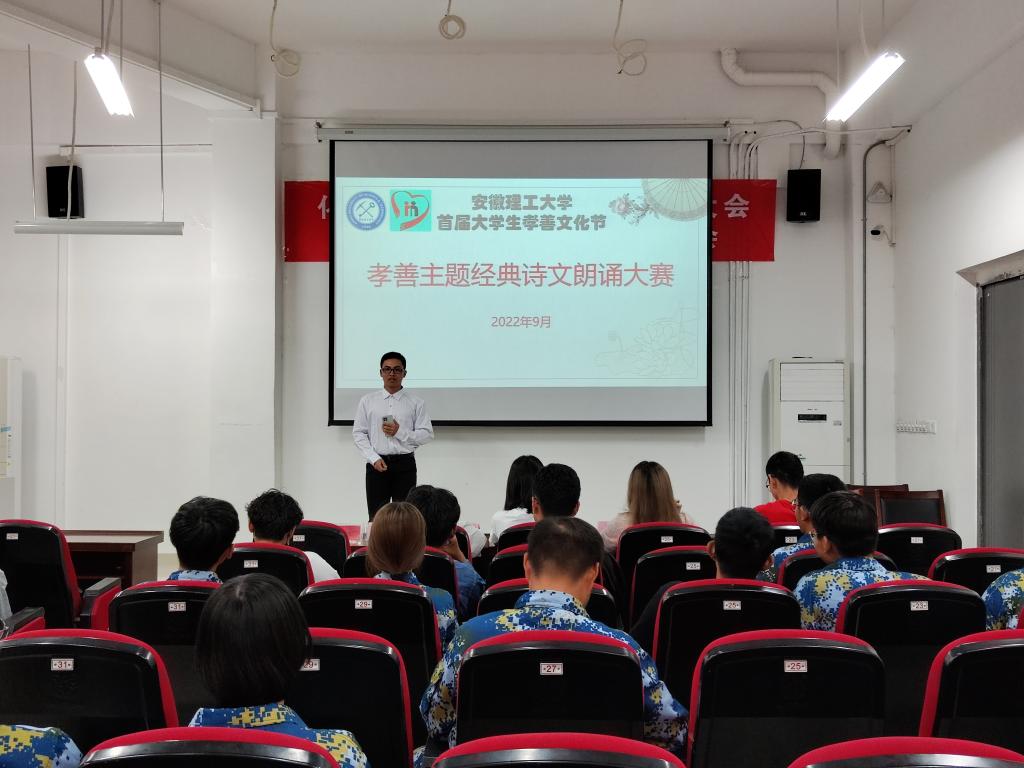 9月24日,孝善文化主题诗文朗诵比赛在崇礼楼东102报告厅举行。活动通过线上报名的形式进行,吸引了50余名学生的参与。活动中,同学们热情高涨,很多新生第一次远离家乡,与亲人相隔甚远,亲情依旧是联系着的最坚韧的纽带,诵读诉说的是辛劳与不易,歌曲吟唱的是牵挂与孝心,以最真挚的情感歌颂“孝善”文化,弘扬了家人、亲人间的传统美德。经过一个半小时的激烈角逐,弹药21-6班沈菲等2名同学获一等奖,能化22-2班李凌康等四名同学获二等奖,应化22-1班柳梦梦等六名同学获三等奖。