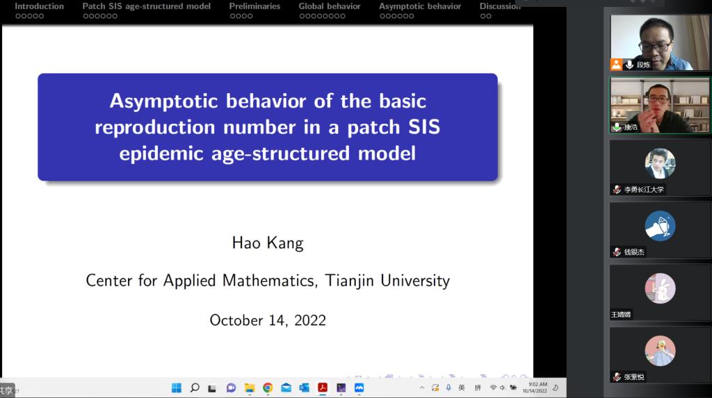 10月14日上午,应科研部和数大学院的邀请,天津大学康浩博士应邀作了题为“Asymptotic behavior of the basic reproduction number in a patch SIS epidemic age-structured model(一类斑块SIS传染病年龄结构模型基本再生数的渐近行为)”的线上学术报告。副院长段炼主持报告会,50余名相关研究方向的教师和硕士研究生认真听取了报告。