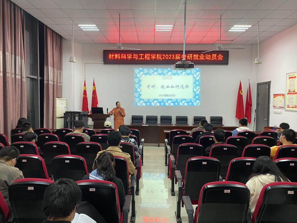 为引导毕业生树立正确的就业观、职业观、人生观,强化“就业育人”实效,10月13日,材料科学与工程学院在崇义楼B118召开2023届学生考研就业动员会议,会议通过线上线下同步开展。学院党委副书记陈向君、副院长王庆平、毕业班辅导员和2023届全体本科生参加会议。
