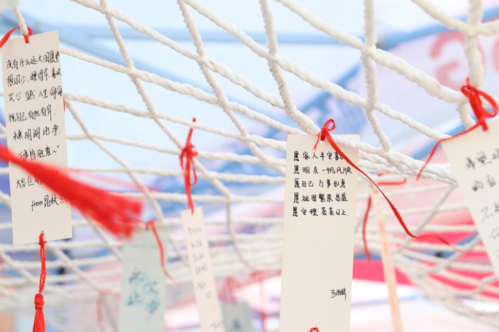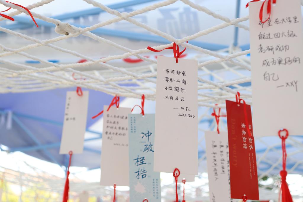 本次心愿网活动面向全校2022级全体新生,新颖的活动方式和活动内容受到了同学们的广泛关注和欢迎,来自各个学院新生积极参与活动。活动现场,学生将自己对大学四年的目标与期盼写在心愿卡片上,并亲手将卡片系上心愿网,一张张卡片迎风飘动,象征着同学们各自怀揣的青春梦想正在启航。有人希望学好高数打好基础、有人希望能在“新生杯”篮球赛上一展身手、有人希望教资和六级必过、有人希望能控制好自己玩游戏的时间、有人希望自己能坚持每月看完一本书籍、有人希望今年的硕士研究生考试能顺利上岸……卡片上不但有对大学学业生活的希冀,更有告别过去、成为更好的自己的勇气。“小小的梦想活动可以让同学们客观认知自己的发展目标,从而在人生的新征程中为了梦想而奋斗。希望同学们能‘路遥而不坠其志,行远而不改初衷,登高而不忘俯低’。”说起活动的出发点,易班发展中心指导老师张雨蓓如是说。