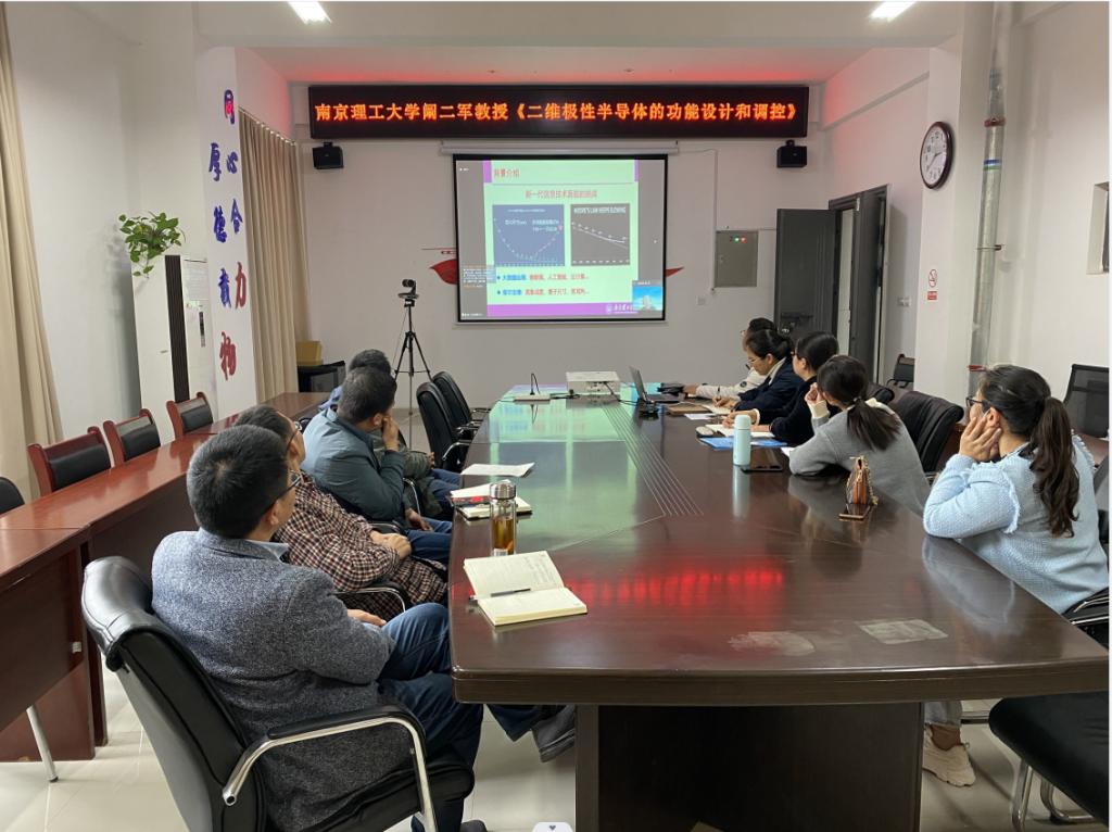 应科研部和力学与光电物理学院邀请,10月28日下午南京理工大学阚二军教授作学术交流并作了题为《二维极性半导体的功能设计与调控》的报告。交流会采用线上线下相结合的形式进行,学院副院长高娟主持交流会,研究生和相关领域教师80余人线上线下同步聆听了报告。