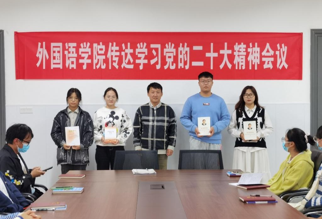 参会学生现场交流了学习感悟。英语21-3班詹晨辰说:“作为一名新时代青年,我们见证了中国走向‘强起来’的十年。在未来的工作和学习中,我将用实际行动贯彻落实党的二十大精神,刻苦学习、接续奋斗,发挥好榜样带头作用。”英语22-4班胡燕凤说:“我们作为强国一代,亲眼见证了党团结带领全国各族人民打赢脱贫攻坚战、全面建成小康社会、经济总量稳居世界第二位等一系列标志性成果。我们对全面建成社会主义现代化强国充满信心!”学院学生第二党支部和院团委向参会学生赠送了《习近平谈治国理政》第三卷、第四卷(英文版)等学习书籍和笔记本。