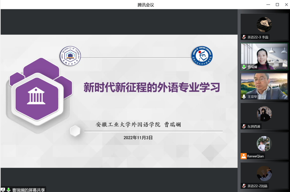 11月2日晚,应科研部和外国语学院邀请,安徽工业大学曹瑞斓教授在线为外国语学院师生作题为“新时代新征程外语专业学习”讲座。讲座由外国语学院院长王宗华主持,学院师生共计200余人参加。