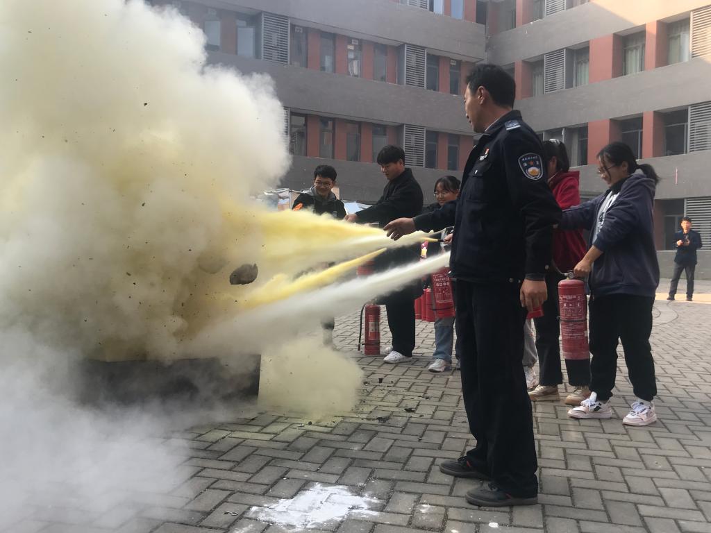 随后,彭广峰老师就消防器材的使用方法对师生们进行了培训,师生们现场参与消防器材灭火操作演练。