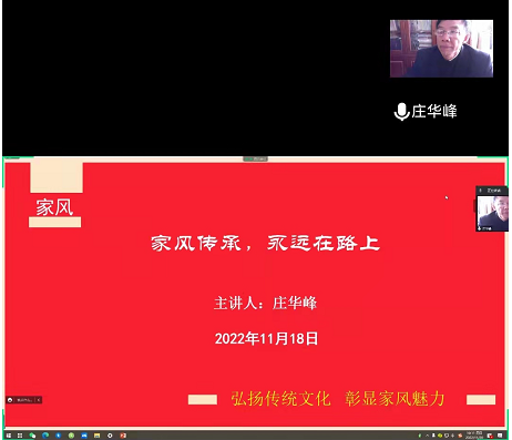 报告中,庄华峰从家风的起源及形成、特征、当代价值及意义、如何建设优良家风等四个方面进行了介绍,列举了古今中外不同人物因家风不同对人生的影响,分析了优秀传统家风流失的原因,结合自身崇尚书法和孝道的家风传承案例,对培育新时代良好家风提出了建议:一是认真读书学习,珍惜光阴;二是勤俭持家,节约粮食;三是弘扬孝道,孝敬父母,真诚待人;四是诚信处事,守约守诺;五是练习书法,传承汉字文化。最后,庄华峰指出,家风对于一个人的精神塑造有着潜移默化的影响,崇德重文是家风的核心,言传身教是传承家风的有效方式,同时,传承家风也需要与时俱进,摒弃封建落后的过时家风,弘扬积极健康的崭新家风。