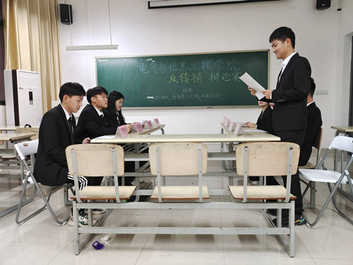 以案示警敲警钟 电信学院各班级辅导员老师以“拒绝传销,净化校园”为主题,召开了主题班会。师生共同学习反传销相关知识,开展传销行为辨识讨论。