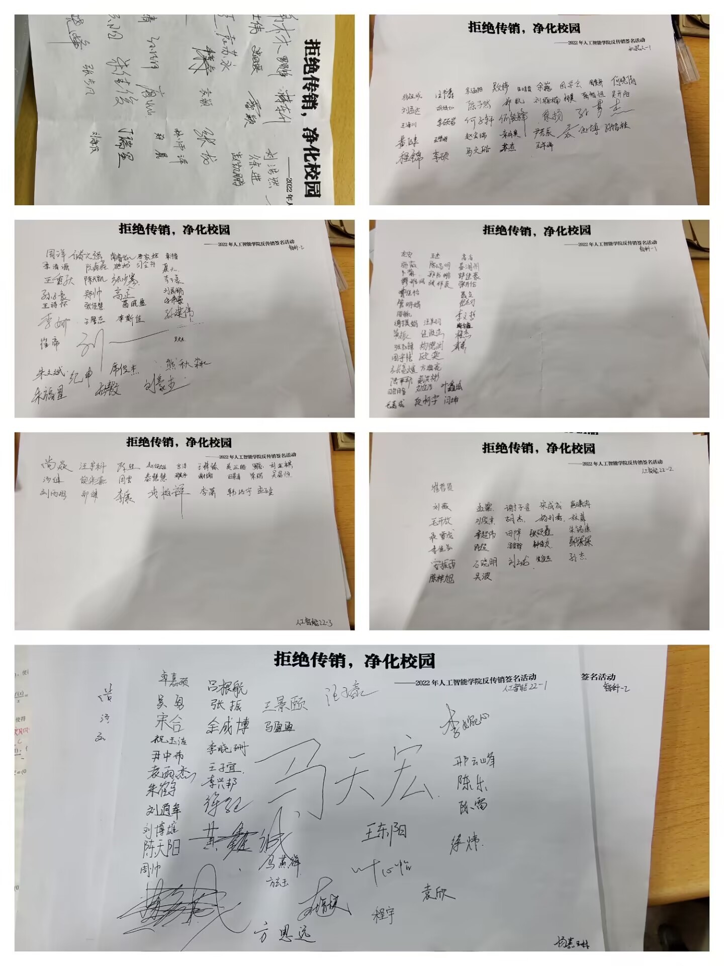 为提高学生安全防范意识,增强对传销的免疫力,9月至12月,人工智能学院结合实际,利用主题班会、网络宣传、辩论赛、签名活动等形式,开展防传销系列活动。