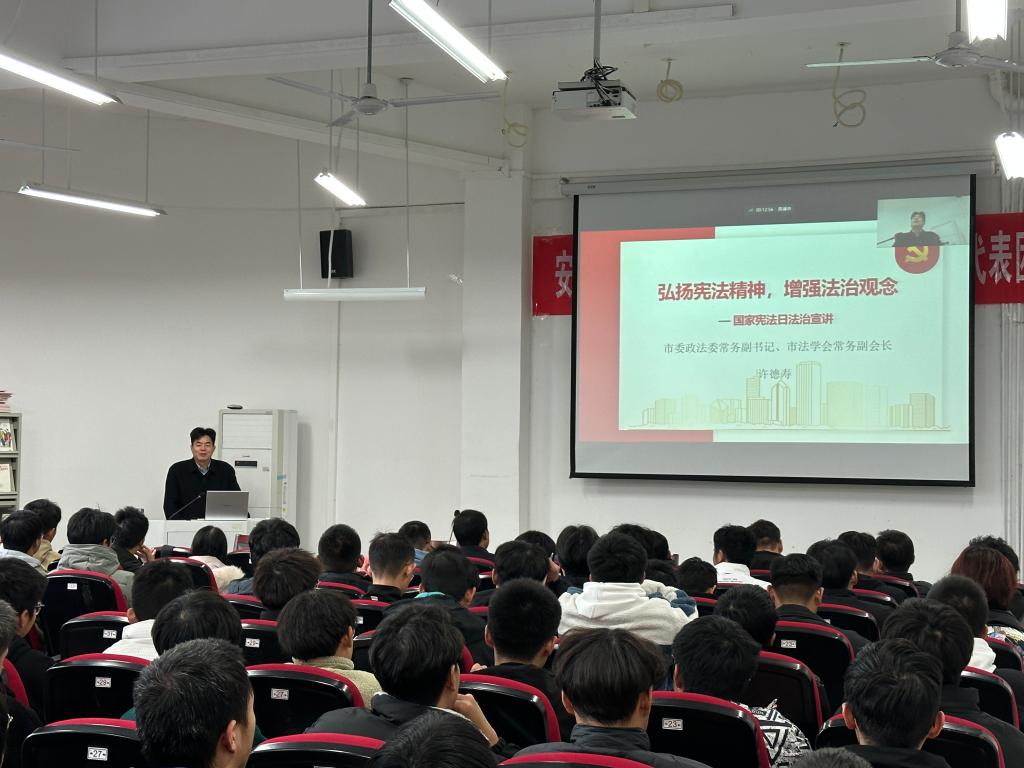 报告会上,许德寿以“弘扬宪法精神 增强法制观念”为主题,从宪法的由来和演变、宪法的内容和特点、宪法的实施和意义等三个方面进行了精彩阐释和解读,教育引导广大师生尊崇宪法、学习宪法、维护宪法、运用宪法。他特别强调,宪法是国家的根本大法,是治国安邦的总章程,宪法的实施既是推进国家治理体系和治理能力现代化的重要路径,也是实现中华民族伟大复兴的重要保障,更是回应社会主要矛盾发生转化的重大举措。他号召广大师生严格遵守宪法和法律规定,在工作、学习和生活中严格依法规范自己的行为,做学法、知法、懂法、守法的新时代法治模范。