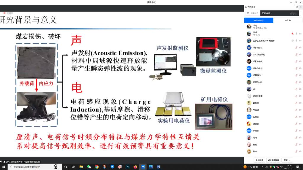 12月1日下午,应科研部和力学与光电物理学院邀请,辽宁工程技术大学肖晓春教授作题为《煤岩破坏的力-声-电演化规律及灾变倾向研究》的学术报告,学院副院长高娟主持报告会,相关研究领域教师和研究生50余人以线上和线下相结合的方式听取了报告。