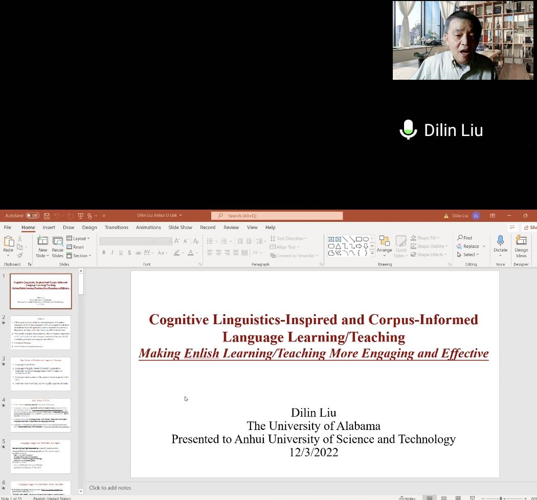 12月3日上午,应科研部和外国语学院邀请,美国阿拉巴马大学英语系荣休教授,TESOL项目主要负责人Dilin Liu教授在线为外国语学院师生作了题“Cognitive Linguistics-Inspired and Corpus-Informed Language Learning/Teaching: Making English Learning/Teaching More Engaging and Effective”讲座,讲座由外国语学院副院长周宁主持,外国语学院教师、研究生60余人聆听了讲座。