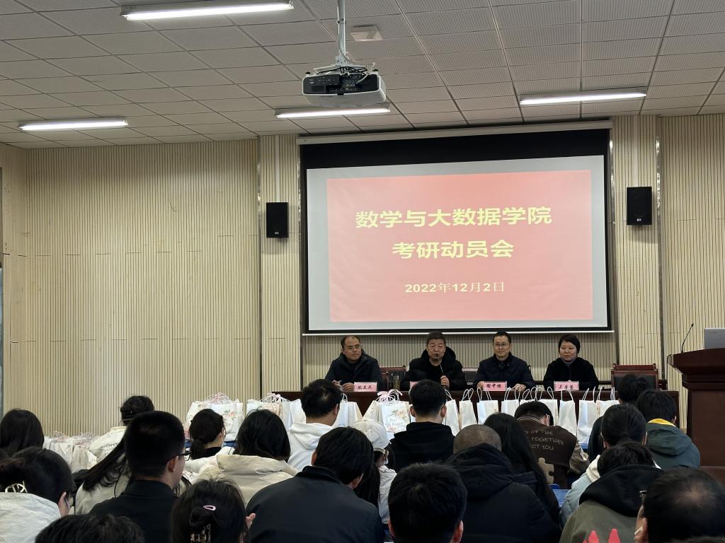 追风赶月莫停留,“研”途尽处是春山。正值考研冲刺阶段,12月2日下午,数大学院在明道楼一楼报告厅举行2023届考研慰问会。学院党委书记谢中根、院长赵前进、副书记马蓓蕾、副院长耿显亚、毕业班辅导员以及全体考研学子参加此次活动。