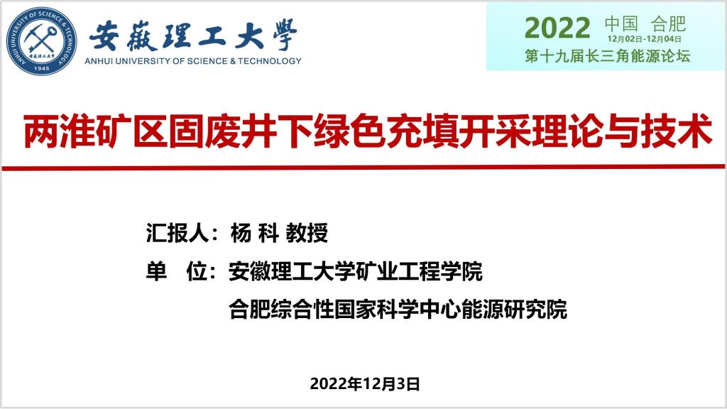 会上,杨科教授作了题为“两淮矿区固废井下绿色充填开采理论与技术”的主题报告。报告提出了安全、经济、技术、政策等20个指标的绿色充填开采可行性评价体系,发展原位充填、低位充填、高位充填的技术集成模式,形成“三层位”空间立体式充填方法。相关研究内容得到合肥综合性国家科学中心能源研究院(安徽省能源实验室)项目“煤基固废无害化利用与绿色开采基础研究”、国家重点研发计划项目课题“多源煤基固废协同利用与绿色充填关键技术”、国家基金重点项目“煤矸石基功能材料井下利用的基础研究”等资助。研究成果已在山西焦煤霍尔辛赫煤业成功应用,得到了山西日报等多家媒体报道。