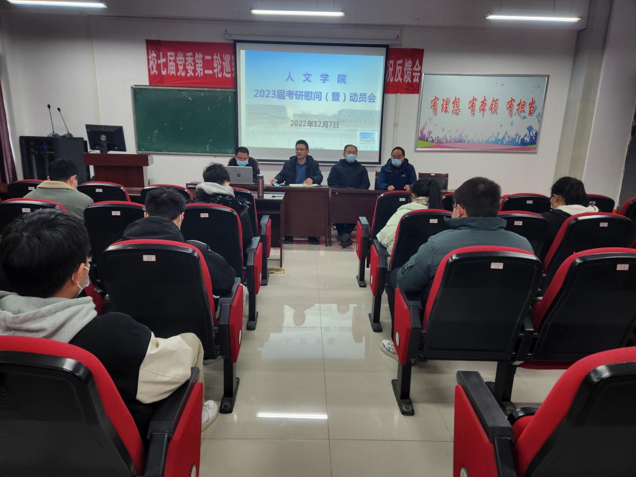 为坚定学院2023届学子考研必胜的信心和勇气,提升应试备考的技巧,12月7日下午,人文学院通过“线上+线下”相结合的方式举办了以“风雨考研路,关怀暖人心”为主题的2023届考研学生慰问活动。学院领导、教研室主任、带班辅导员以及130余位考研代表参加了活动。