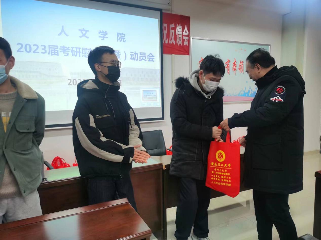 社会工作教研室主任苟延峰博士结合自身的求学经历,就研究生入学考试的科目、题型、作答技巧等为考研学生作考前辅导。会后,学院领导为学生代表发放考研“加油包”,表达了对考研学生的殷殷嘱托。