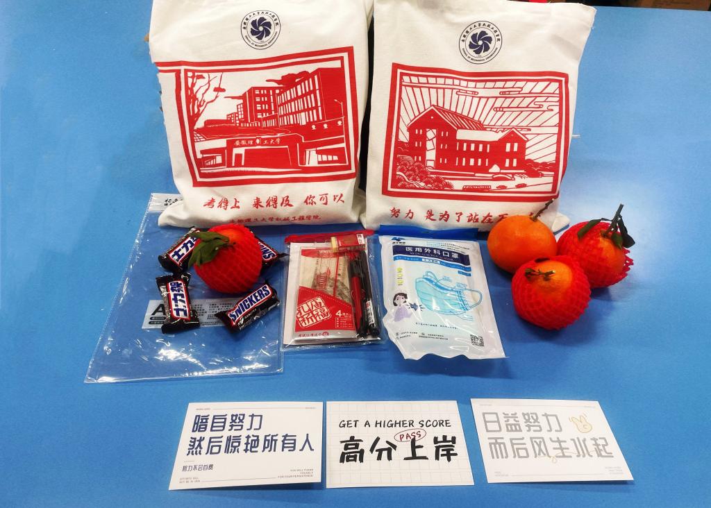 随后,学院班子成员走到同学们中间,逐一为他们送上精心准备的“考研福袋”。定制的特色福袋里,装着学院全体老师手写的一“研”为定祝福卡片、“心想事成”“前程似锦”橙、“动力满满”“潜力无限”士力架、“连中三元”考试用具以及“护你上岸”防护口罩等。