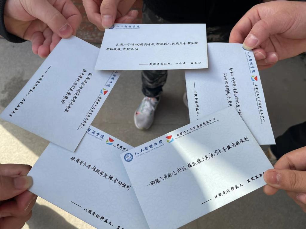 人工智能学院高度重视2019级考研学生的备考工作,学院领导、学业导师以“面对面”“键对键”等方式表达对考研学子的关心与慰问;辅导员经常与考研学子交心谈心,帮助同学们进行心态调适和心理疏导,鼓励大家在考研冲刺的关键阶段调整心态、坚定信心。此次慰问活动学院精心为考研学子准备了“加油包”。其中不仅有铅笔、橡皮等各类考试用具,还有面包、口罩,以及由大一大二学弟学妹们亲手写的祝福明信片,饱含了人工智能学院全体师生对考研学子的真挚关心与美好祝愿。