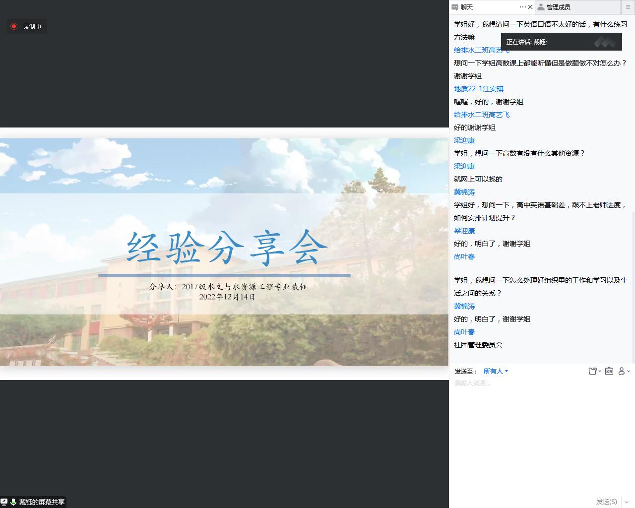 为帮助新生树立明确的奋斗目标,协调学习、生活、科研与实践的关系,实现自我认知的提高,12月14日晚,学院以线上会议的形式组织开展了两场成长励志报告会。活动分别邀请了2021届水文与水资源工程专业戴钰和2022届水文与水资源工程专业孟涵两名优秀毕业生分享了自己的大学学习心得和成长发展历程。院党委副书记贾伟主持会议,全体2022级新生参加了报告会。