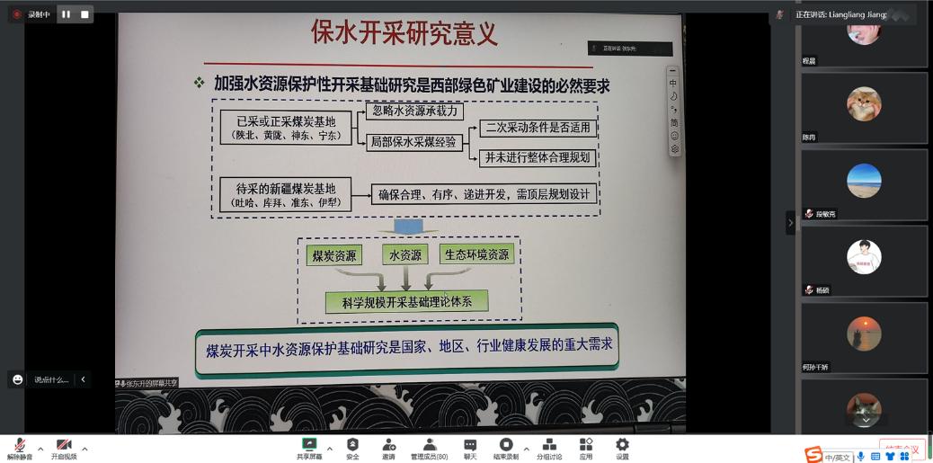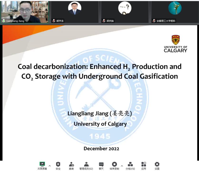 为进一步加强矿业工程高峰学科建设、提升研究生科研素养、保证研究生线上教学效果,12月20日,学院院长杨科教授和涂敏教授邀请中国矿业大学张东升教授和加拿大卡尔加里大学姜亮亮研究员做客“能源大讲堂”,走进《矿业工程学科前沿讲座》课堂,分别作了题为《煤矿绿色开采进展与关键技术》和《Coal decarbonization Enhanced H2Production and CO2Storage With Underground Coal Gasification》的线上报告,为2022级研究生讲授了关于绿色开采、煤炭地下气化及CO2封存等知识。报告会由矿业工程学院院长杨科教授主持,矿业工程学院等相关学院200余位师生参会交流学习。