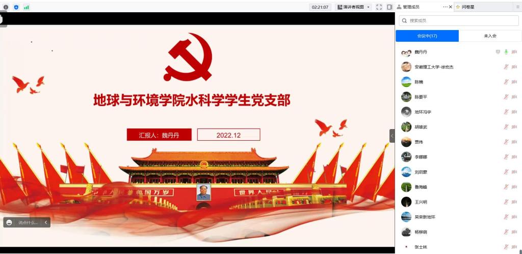 近日,地球与环境学院线上召开党支部书记抓党的建设工作述职评议会议。学院党委委员、各党支部书记和师生代表参加会议。会议由学院党委书记陈楠主持。
