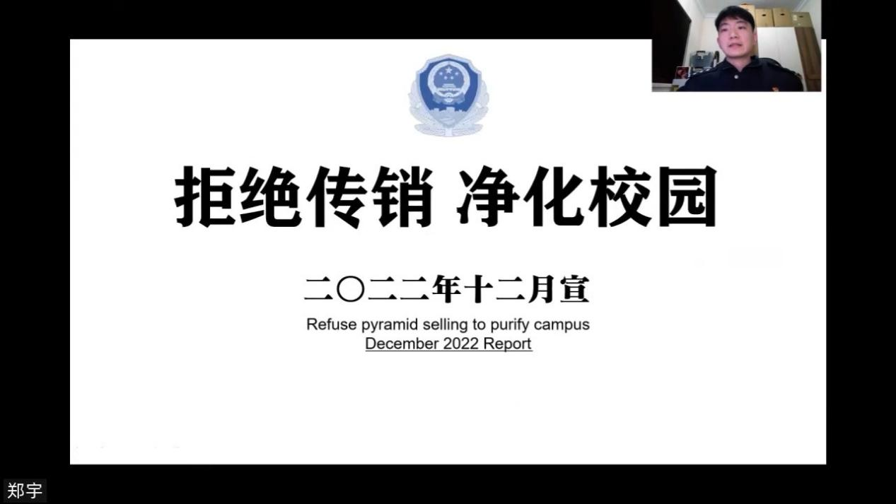 知己知彼,百战不殆。郑宇警官在讲座中详细介绍了传销组织的性质和特征,利用多个视频案例生动展示传销组织的日常运作形式。通过对传销产业链进行分步骤演示,让同学看清楚传销是如何给人洗脑画饼的,想明白传销是怎样导致成员家破人亡的,进一步加深同学们对传销的认识,了解其对个人、家庭和社会的严重危害。