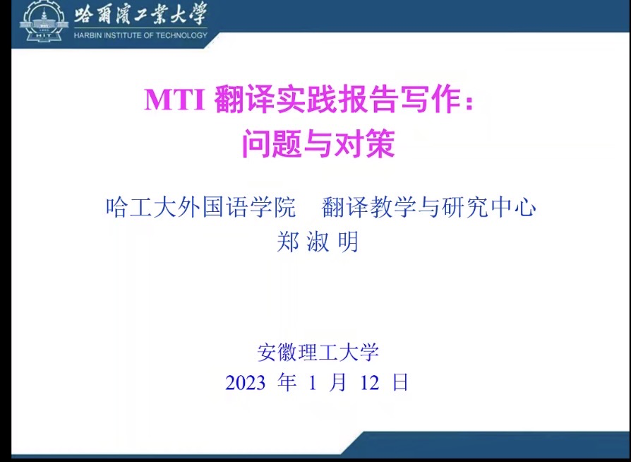 1月12日晚上,应科研部和外国语学院邀请,哈尔滨工业大学郑淑明副教授在线为外国语师生作题为“MTI翻译实践报告写作:问题与对策”讲座。讲座由副院长周宁主持,研究生导师及全体研究生共计60余人参加。