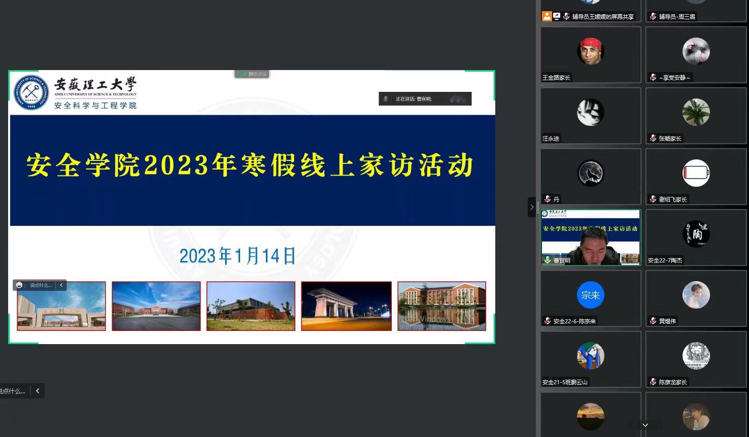 为形成家校育人合力,深入践行“三有”理念,1月14日晚,安全学院开展2022年寒假线上集中家访活动。学院党委副书记曹宣明、全体专职辅导员、资助宣传大使、主要学生干部以及各年级家长等300余人参加会议。