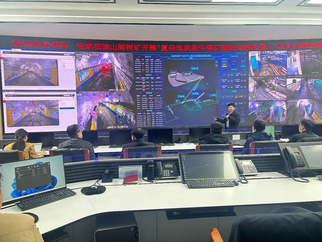 现场检查阶段,专家组分两组分别前往地面调度室、采三区井下上部车场等地,查验相关系统、装备、产品等研发情况,并在调度室通过远程控制先后进行单轨吊运输机器人和电机车运输机器人运行、避障实验。