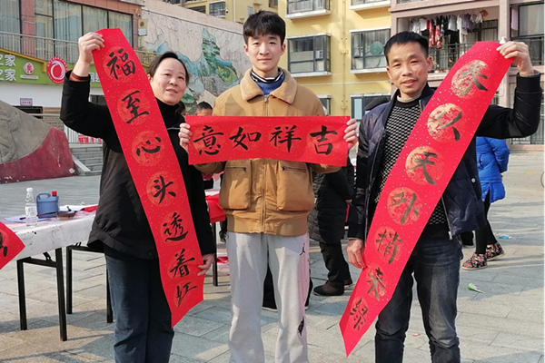 书写春联,是笔尖上陈久弥香的年味,是民俗中传承千年的宝藏。药学21-1班陈李祥睿同学是凤冈县书法协会的一名成员,寒假期间参加家乡的迎新春送万福进万家书赠春联公益活动,走进易地扶贫搬迁安置点龙泉街道凤翔社区挥毫泼墨为大家题写春联送祝福,现场居民忙着挑选心仪的对联,一片祥和喜庆的景象。